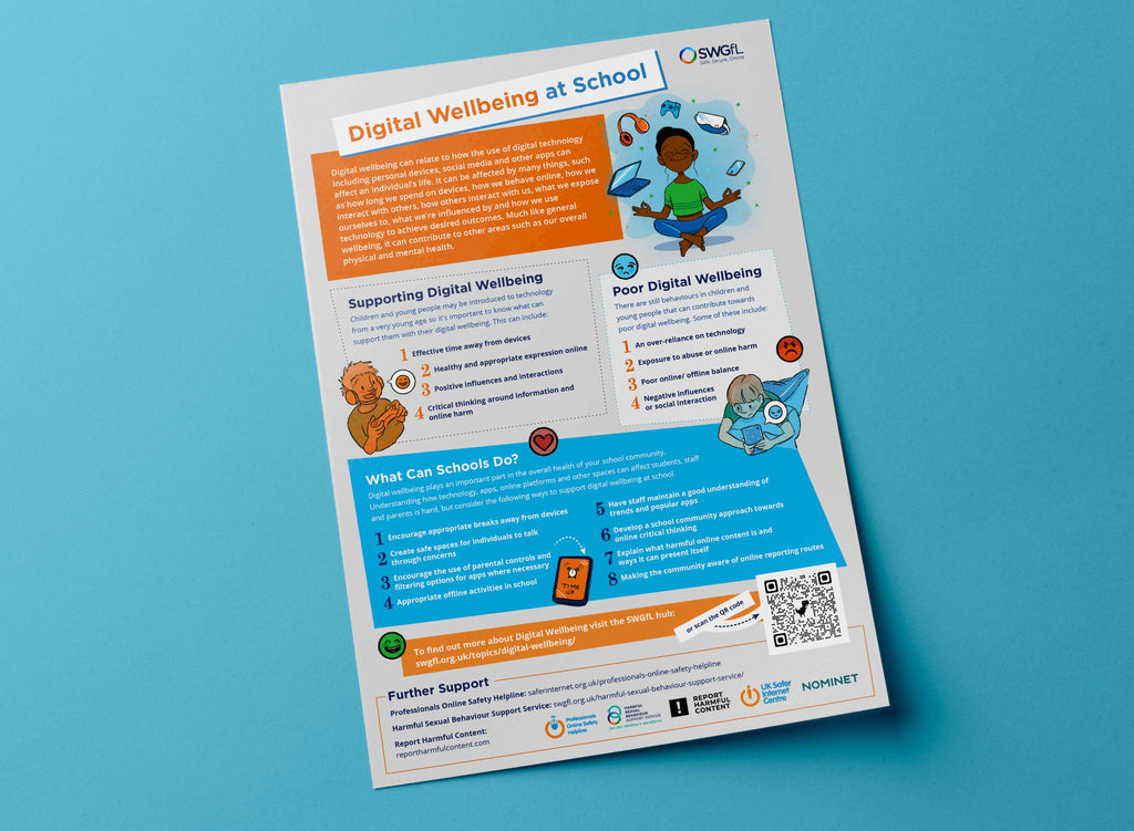 This colourful A3 poster illustrates how professionals can support Digital Wellbeing for children and young people at school. Ideal for staff rooms and communal areas, it provides guidance on what digital wellbeing is as well as what behaviours can lead towards healthy as well as poor digital wellbeing. This poster is part of our digital wellbeing hub that explores the topic in more detail. Included are sections on: